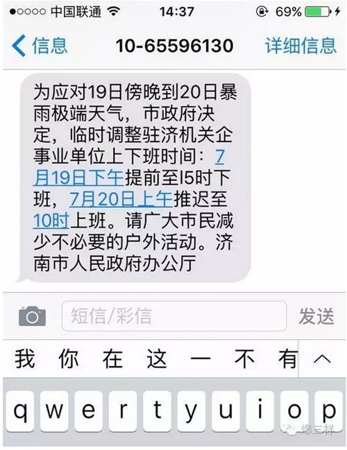 其內(nèi)容為:為應(yīng)對(duì)此次極端天氣,確保人民群眾生命財(cái)產(chǎn)安全,市政府決定,臨時(shí)調(diào)整駐濟(jì)機(jī)關(guān)、企事業(yè)單位上下班時(shí)間:7月19日下午提前至15時(shí)下班,7月20日上午推遲至10時(shí)上班。同時(shí),提醒廣大市民減少不必要的戶(hù)外活動(dòng)。