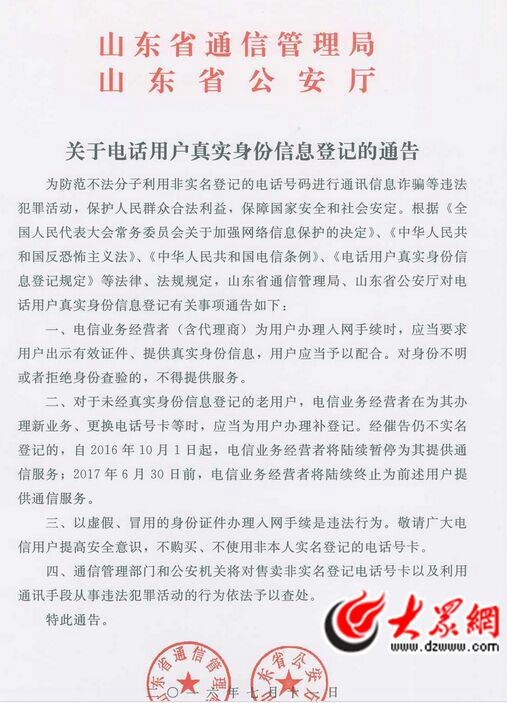 大眾網濟南8月3日訊 手機實名制終于動真格了!近日,山東省通信管理局給各大電信運營商下發了《關于電話用戶真實身份信息登記的通告》,要求電信運營商對還沒有實名制登記的用戶,將于今年10月1日起陸續暫停服務。