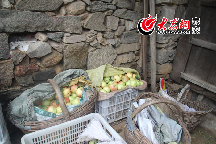 從崔啟傳家的果林到家里,步行大約需要5分鐘。道路都是土路和斜坡,不是特別好走。老兩口要提著籃筐到果林去把成熟的蘋果摘下,再用擔子擔回家。一趟兩人要走20分鐘。