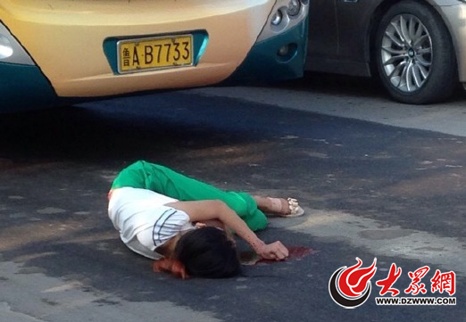 女子倒在公交車前,11日有目擊者稱女子是自己主動撞上公交車的