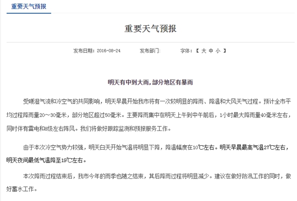 記者從濟南市氣象臺了解到,今天早晨6:00,濟南百花公園監測點氣溫還保持在24.3℃左右,隨后一路飆升,截至14:00,已經達到了34.2℃。不過明天,也就是今年三伏的最后一天了,馬上來到的降雨將讓濟南的氣溫驟降10℃。濟南市氣象臺工作人員告訴記者,受副高南退影響,雨水從北部南移,預計會在明天早晨5:00-8:00左右到達濟南。工作人員說,根據目前的情況預測,屆時濟南北部地區降水會比較多,但具體哪個區域會出現暴雨還要看當時的氣象情況。