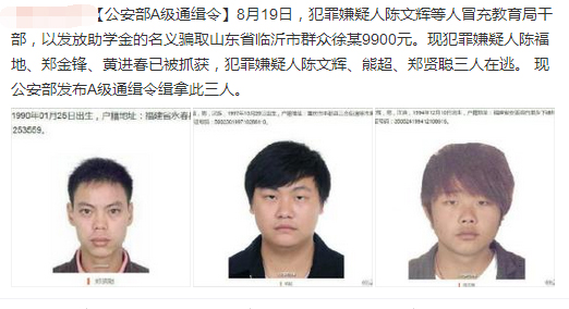 8月26日18:21,公安部刑偵局通報稱,詐騙徐玉玉的犯罪嫌疑人已經有3人被抓獲,另有陳文輝、鄭賢聰和熊超3人在逃。同一時間,公安部發出最高級別的A級通緝令,公布了3名在逃犯罪嫌疑人的身份信息和照片,對發現線索的舉報人、協助緝捕有功的單位或個人,每抓獲一名犯罪嫌疑人將給予人民幣五萬元獎勵。