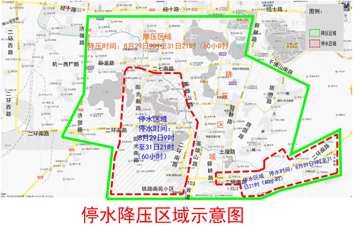 據濟南水務集團在施工現場的工作人員介紹,未來3天停水區域包括陽光新路以東、臥龍路及二七南路以南、英雄山路以西區域以及二環南路(舜耕路以東)沿線兩側用戶。除停水區域外,部分地區因水壓下降還會出現水流減弱,具體包括濟微路以東、經十路以南,舜耕路以西區域降壓。因位置、地勢差異,降壓程度會有所不同。