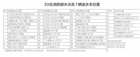 為確保施工期間居民生活用水,濟南水務集團已調集應急送水車11輛(其中7輛為固定點送水,4輛為流動點送水)為市民反映較為集中的區域免費送水,28日下午,11輛送水車已經全部到位,并進行了清洗和消毒,確保水質達標;設立33處消防取水點安排專人值守方便居民接水,28日下午,濟南水務也對33出消防取水點進行放水,去除管網末梢的死水,保障水質。