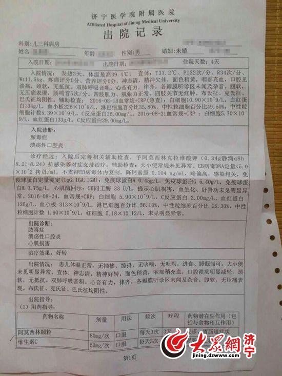 大眾網(wǎng)濟(jì)寧8月29日訊 25日上午,肖女士撥打濟(jì)寧大眾網(wǎng)新聞熱線(0537-2372789)反映,21日她15個(gè)月大的孩子張明明(化名)發(fā)燒住進(jìn)濟(jì)寧醫(yī)學(xué)院附屬醫(yī)院(簡稱:濟(jì)醫(yī)附院)兒科病房,當(dāng)天在沒有醫(yī)囑的情況下,被護(hù)士弄混了名字做了腦電圖,家屬希望兒科醫(yī)生就此道歉解釋卻遭到拒絕,還被兒科主任醫(yī)師搶走了手機(jī)。23日晚,值班護(hù)士給孩子輸液,輸液完成后,家屬竟發(fā)現(xiàn)針頭脫針,一袋消炎藥全流在了被褥床單上。家屬要求換被子,護(hù)士卻說太晚了得等明天。