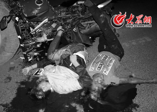 摩托車上兩人都當場死亡,血流一地(為避免讀者不適反應,圖片做黑白色處理)