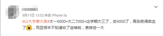 9月3日,山東大學濟南校區開學迎新。很快,在微博上,很多高年級的學長就該校的學費開始了新一輪的接力吐槽。該校2013級的一名同學發微博說:記得當年高考報考指南上山大標的學費是1年4500元,大一卻變成了6700元。學費貴這個問題去年就比較熱了,有的同學連學分收費依據是什么、什么是注冊費這些基本問題都不清楚,學校為啥還不解疑釋惑? “第一年學費四千多,第二年六千多,第三年八千多,兩年學費翻了一番!本W友“臭屁良-”曬出了自己的學費單,以此表達不滿。山大軟件工程專業平均每年要交學費12000元的例子,被許多學生看做是學費貴的有力證據,被大量轉發。