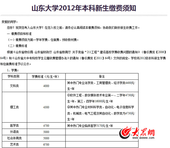 山東大學2012年本科新生繳費須知