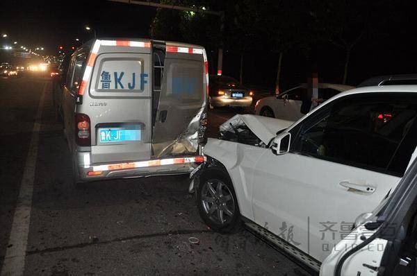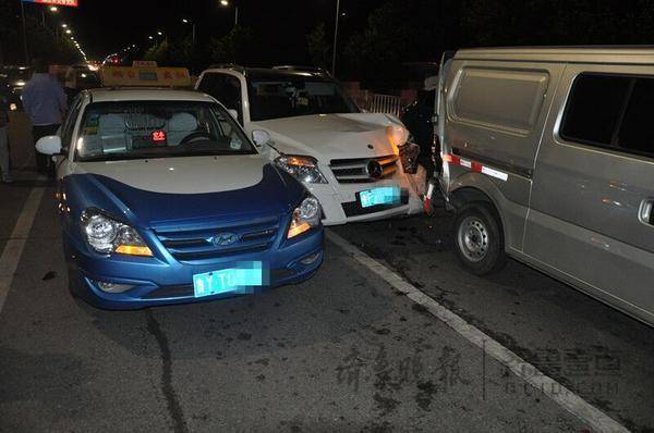 事故現場,路口東側的停車線后的中間兩排機動車道上,分別停著4輛車,最前面的是一輛福特皮卡,一輛銀色廂式面包車拱在福特車的車尾部,在面包車右側停著一輛浪花出租車,一輛白色奔馳suv則一頭扎進了面包車與出租車之間的縫隙中。其中奔馳車受損最嚴重,左側前臉凹了進去,左大燈碎裂,發動機蓋翹起。至于面包車則被奔馳車撞在了車輛右后方,右車廂門下端凹了進去,上端門被撞開。福特皮卡車和出租車也有不同程度的剮蹭損傷。
