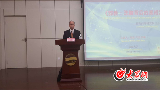 10月23日,美國著名邪教問題研究和干預專家瑞克·艾倫·羅斯在青島大學舉辦題為《邪教:洗腦背后的真相》的邪教問題研究報告會。