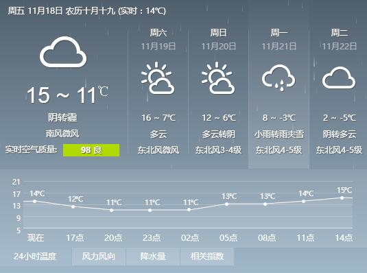 預計21日早晨到傍晚,全市有小雨,21日前半夜到22日中午全市有中到大雪,將出現積雪和道路結冰。21日中午到22日傍晚,東北風4到5級,陣風八級左右。自21日白天開始不斷有冷空氣影響我市,氣溫明顯下降,過程降溫幅度15℃左右,22到23日,最低氣溫-7到-4℃,最高氣溫2℃左右,24日早晨氣溫到了最低,北部地區及山區-8℃左右,市區及其它地區-6℃左右,最高氣溫3℃左右,25日白天氣溫開始逐步回升。