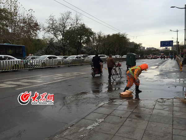 早高峰8:28 趵突泉北路 一環衛工正化冰除雪。 記者 王長坤 攝