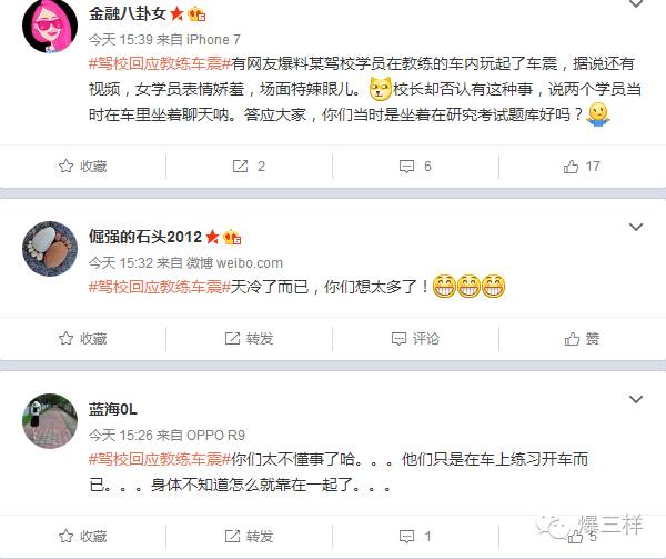 對(duì)于眾人熱議的“車震”一說,涉事駕校的校長回應(yīng)稱,這都是謠傳,視頻拍攝于一周前,拍攝者系事發(fā)小區(qū)的物業(yè)工作人員,平時(shí)禁止教練車入內(nèi);當(dāng)時(shí),該教練車教練臨時(shí)外出,兩名學(xué)員系戀人關(guān)系,事發(fā)時(shí)在車內(nèi)聊天。對(duì)此,臨沂市交通局運(yùn)管處工作人員也表示,已向駕校了解此事,校方正進(jìn)行核實(shí)調(diào)查。