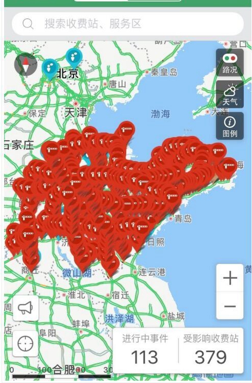 G2京滬高速魯冀主線收費出口臨時封閉。蟠龍、彩石、曹范、埠村、雪野、萊蕪北、萊蕪高新、魯蘇省界收費站上海方向出入口臨時封閉。商河、濟陽北、濟陽西、樂陵西、樂陵南、臨邑、樂陵北、港溝、鋼城、萊蕪東、新泰東、蒙陰、孟良崮、青駝、臨沂北、臨沂、臨沂南、蘭陵、郯城、紅花埠收費站雙向入口臨時封閉。
