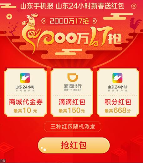 三種紅包隨機派發,每天派發數量超過10萬個,春節購物、出行幸福滿滿!山東手機報讀者、“山東24小時”客戶端用戶均可參與,搶好運,搶福氣!