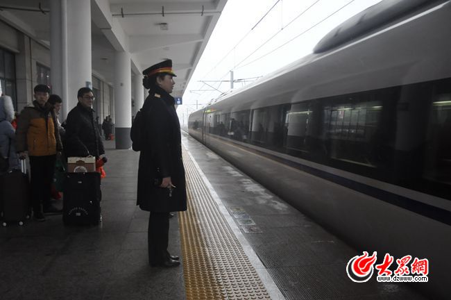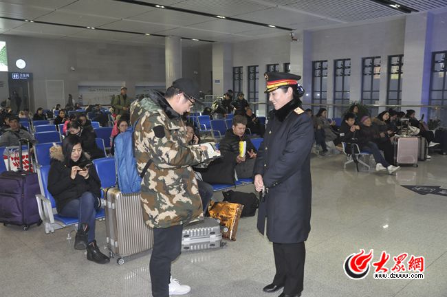 19日下午,煙臺南站客運主任李好先是手把手教給五名青年志愿者,如何幫助旅客使用自動取票機。接著又回到候車室引導旅客檢票,去安檢處幫著一起看安檢儀。列車來了,她又冒著風雪到站臺上維持秩序,直到旅客全部安全上車,看看列車駛出站臺,她才回到屋內。