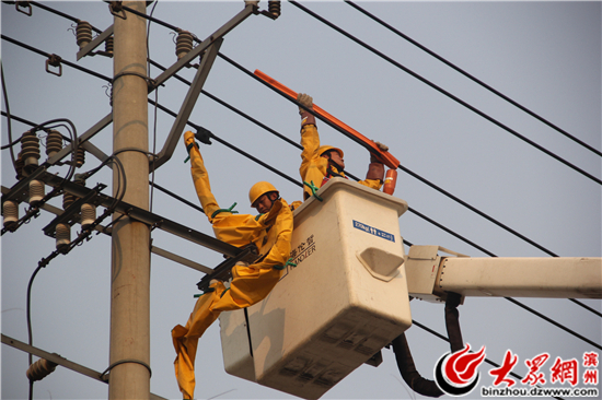 “掛好安全帶。”班長李海濤大聲喊道。1月26日14點20分,在濱州市黃河一路渤海十六路附近的黨校十支線26號電桿,一處螺絲松動引發刀閘發熱,很容易燒斷線路,嚴重的話會影響大線路安全運行,濱州供電公司配電運檢室帶電作業班的李海濤、張默迪、湯洪沂和常龍龍正在進行帶電作業。