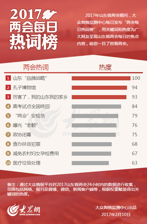 大眾網(wǎng)濟(jì)南2月10日訊 今天,大眾輿情監(jiān)測(cè)中心發(fā)布第六期“兩會(huì)每日熱詞榜”。“山東‘品牌戰(zhàn)略’”“孔子博物館”和“厲害了,我的山東我的家鄉(xiāng)”分別以100、94、93的熱度位列熱詞榜的前三名。
