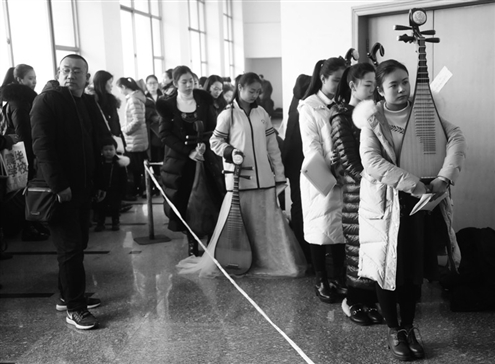 相對于美術(shù)、廣電編之類的專業(yè),昨天的音樂表演復(fù)試現(xiàn)場“童子功”更多一些。不少考生從小就學(xué)樂器,十年“樂齡”不在少數(shù)。在中國樂器專業(yè)復(fù)試考場外,正在候考的東營考生朱心語就是其中一個。朱心語是六歲開始學(xué)揚琴的,“當時是媽媽給我報的興趣班,后來自己慢慢喜歡上了。”她笑著說自己很想當演員,但自認模樣長的不夠漂亮,所以希望通過學(xué)樂器“曲線”圓夢。