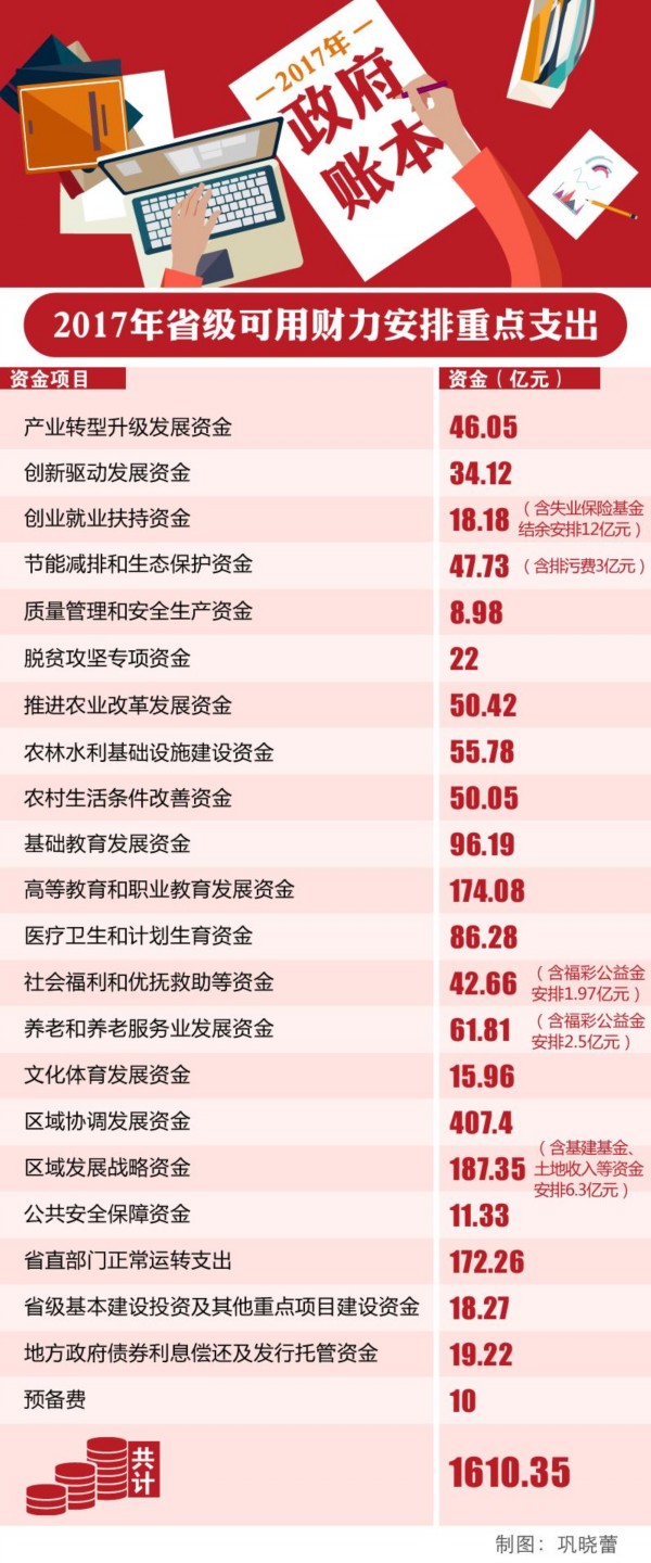 2017年,全省一般公共預算收入安排6172億元,加地方政府新增一般債券收入、中央稅收返還和轉移支付補助等,收入共計9648.18億元。全省一般公共預算支出安排9405.7億元,加上解中央支出及結轉下半年支出等,共計9648.18億元。收支達到平衡。