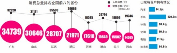 其中,第一經濟大省廣東的社消總額達到了34739億元,在各省份中高居榜首。第三經濟大省山東緊隨其后,其社消總額也突破了3萬億大關。日前,山東省政府出臺推進全省商貿流通現代化的實施意見,提出到2020年實現社會消費品零售總額4.5萬億元,年均增長10%左右,商貿流通信息化、標準化、集約化水平明顯提高。
