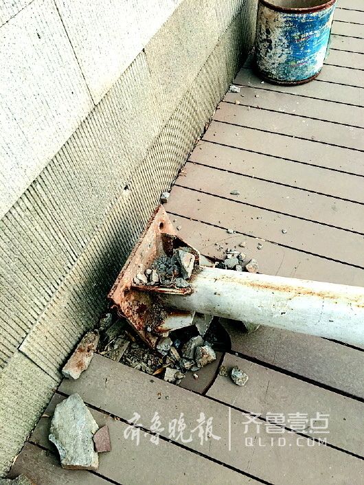 當日上午10點,記者來到了歷山北路與小清河北路交叉口東北角的板橋碼頭。記者注意到,立柱的底座則被大風直接吹斷,斷口處鐵銹很多,鐵管的鐵皮也很薄。記者看到,相比于袁先生發的凌亂現場,現在情況好了很多,兩三米長的鐵管被施工人員碼放在北岸。
