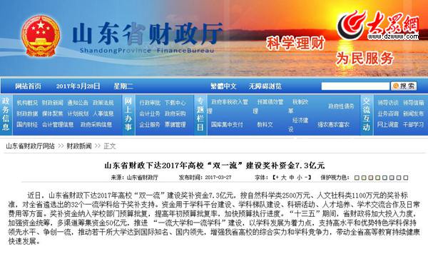 大眾網3月28日訊 記者從山東省財政廳了解到,近日,山東省財政下達2017年高校“雙一流”建設獎補資金7.3億元,按自然科學類2500萬元、人文社科類1100萬元的獎補標準,對全省遴選出的32個一流學科給予獎補支持。