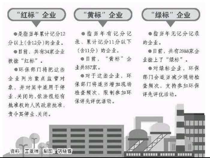 “黃標”企業,指當年有記分記錄、累計記分11分以下(含11分)的企業。對于這些企業,環保部門將適當增加現場檢查頻次,限制參加環保評先評優活動。目前,“黃標”企業共557家。