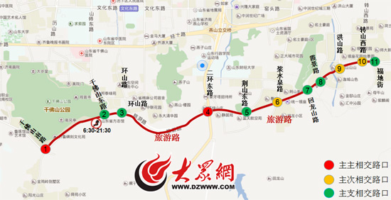 濟南交警支隊公布的交通管理方案顯示,2017年4月28日(周五)起每個工作日的早高峰(7:00-9:00),對旅游路沿線的千佛山東路、荊山東路、漿水泉路、霞景路、福地街路口東西向采取禁止左轉措施。在此之前,千佛山東路路口的西口已經實行早6:30到晚21:30限時禁止左轉。