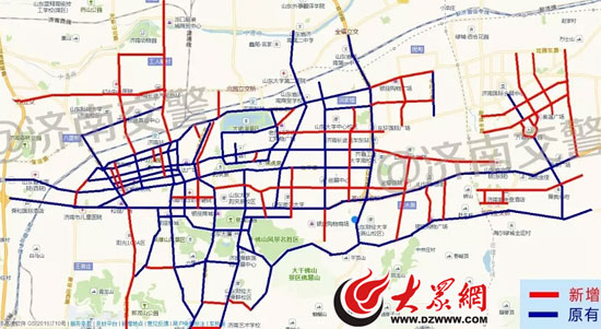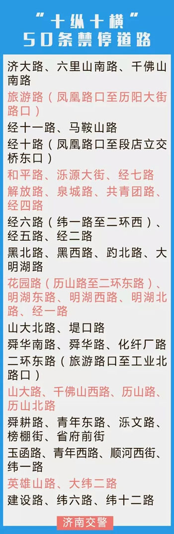 原有的這50條道路分別為:濟大路、六里山南路、千佛山南路、旅游路(鳳凰路口至歷陽大街路口)、經十一路、馬鞍山路、經十路(鳳凰路口至段店立交橋東口)、和平路、濼源大街、經七路、解放路、泉城路、共青團路、經四路、經六路(緯一路至二環西路)、經五路、經二路、黑北路、黑西路、趵北路、大明湖路、花園路(歷山路至二環東路)、明湖東路、明湖西路、明湖北路、經一路、山大北路、堤口路、舜華南路、舜華路、化纖廠路、二環東路(旅游路口至工業北路口)、山大路、千佛山西路、歷山路、歷山北路(北園大街到濱河南路)、舜耕路、青年東路、濼文路、榜棚街、省府前街、玉函路、青年西路、順河西街、緯一路、英雄山路、大緯二路、建設路、緯六路、緯十二路。