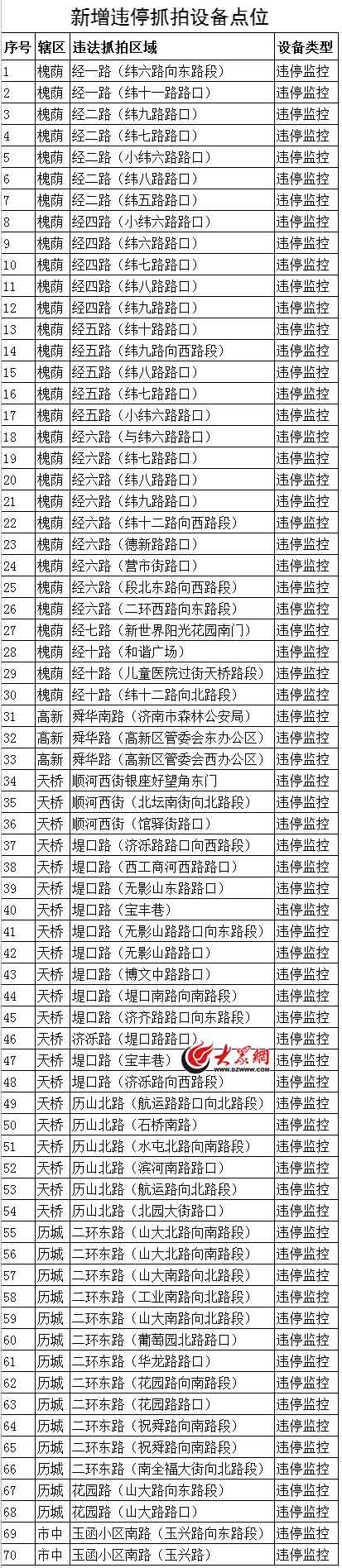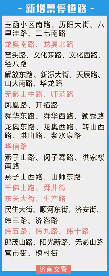 這次新增的50條違停道路有:玉函小區南路、歷陽大街、八里洼路、二七南路、龍奧南路、龍奧北路、窯頭路、文化東路、文化西路、經八路、解放東路、新濼大街、天辰路、山大南路、華龍路、無影山中路、師范路、鳳凰路、開拓路、舜華東路、舜華西路、穎秀路、龍奧東路、龍奧西路、轉山西路、洪山路、漿水泉路、華信路、燕子山路、閔子騫路、洪家樓南路、燕子山西路、山師東路、千佛山路、舜井街、東關大街、生產路、民生大街、順河東街、濟安街、緯三路、濟洛路、緯五路、緯九路、緯十路、郎茂山路、陽光新路、無影山路、營市街、槐村街。