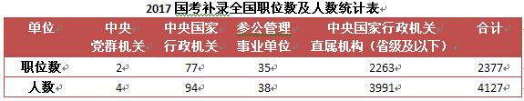本次國考補(bǔ)錄全國共有2377個空缺職位,4127個空缺名額,其中中央國家行政機(jī)關(guān)直屬機(jī)構(gòu)省級及以下級別單位空缺職位數(shù)最多,共有2263個職位3991個名額,分別占全國補(bǔ)錄總職位數(shù)和總名額量的95.20%和96.7%。