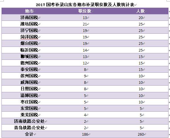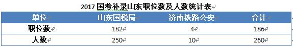 在2017年國考補(bǔ)錄中,山東省共有186個職位260個名額空缺,全部集中在山東國稅局和濟(jì)南鐵路公安兩個單位。其中,山東國稅局提供了182個職位250個名額,分別占山東補(bǔ)錄總職位數(shù)和總名額量的97.85%和96.15%,可以說2017國考補(bǔ)錄山東職位主要就是來自山東國稅系統(tǒng)。