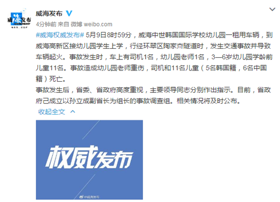 大眾網(wǎng)5月9日訊 今天下午,據(jù)威海市政府新聞辦官方微博@威海發(fā)布消息,5月9日8時59分,威海中世韓國國際學(xué)校幼兒園一租用車輛,到威海高新區(qū)接幼兒園學(xué)生上學(xué),行經(jīng)環(huán)翠區(qū)陶家夼隧道時,發(fā)生交通事故并導(dǎo)致車輛起火。事故發(fā)生時,車上有司機(jī)1名,幼兒園老師1名,3—6歲幼兒園學(xué)齡前兒童11名。事故造成幼兒園老師重傷,司機(jī)和11名兒童(5名韓國籍,6名中國籍)死亡。