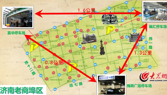 為滿足市民和游客的停車需求,濟南市停車辦聯合駐地區政府并協調商戶,在老商埠街區內設置了槐蔭廣場地下停車場、華聯嘉華停車樓、融匯地下停車場3處大型停車場,共計2300多個停車位。