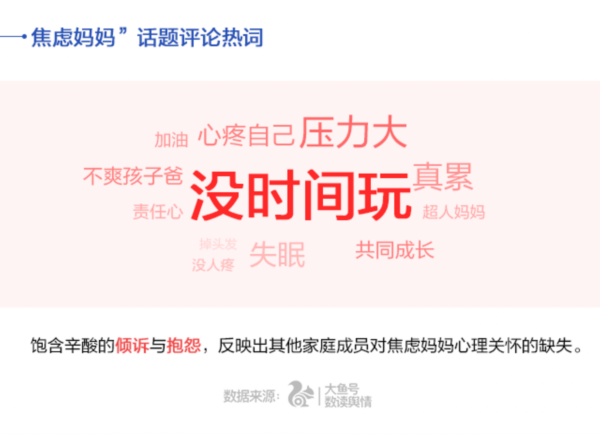 同時(shí),報(bào)告在描繪中國媽媽“焦慮”圖譜時(shí)發(fā)現(xiàn),焦慮媽媽們抱怨最多的是沒時(shí)間玩、壓力太大、失眠等問題,但在另一方面也展示出與孩子共同成長、超人媽媽等積極樂觀的態(tài)度。透過這些滿含心酸的抱怨與自我鼓勵(lì)的話語,我們不難發(fā)現(xiàn)這樣,不論是全職媽媽還是在職媽媽,她們更需要的是家人親朋對自己的關(guān)懷,而不是在夜深人靜時(shí),自己心疼自己。