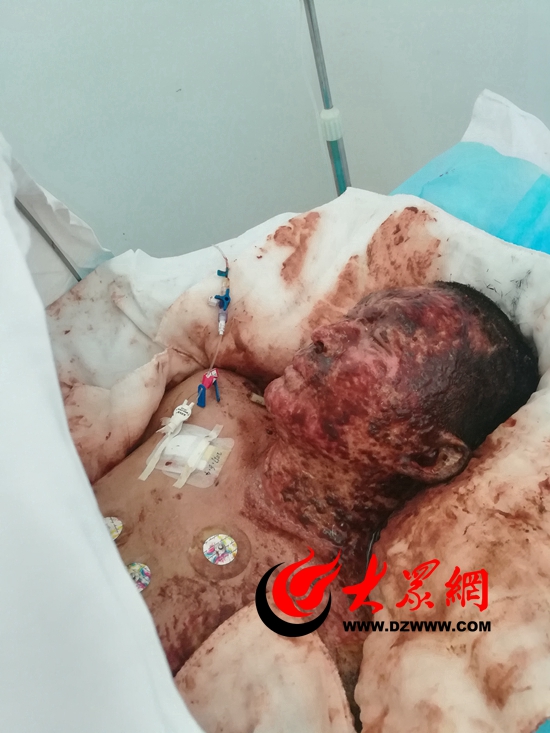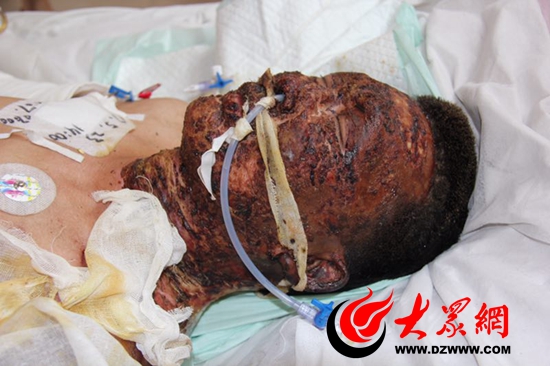 濟南萬厚中醫醫院燒傷科主任李春梅告訴大眾網記者,昨天第一眼見到王暉時,心里猛抽了一下——王暉整個臉部都被燒黑了!除了眼珠能動,王暉其他部位都是焦黑焦黑的,并已經開始感染。劇烈的疼痛,讓這個35歲的小伙已經有些神志不清。