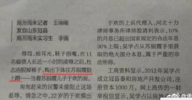 而且蘇銀霞還否認了自己之前對某家媒體拋出的對方要“強奸”她的說法,表示那個脫褲子的討債者很快就被他自己的同伙制止了。