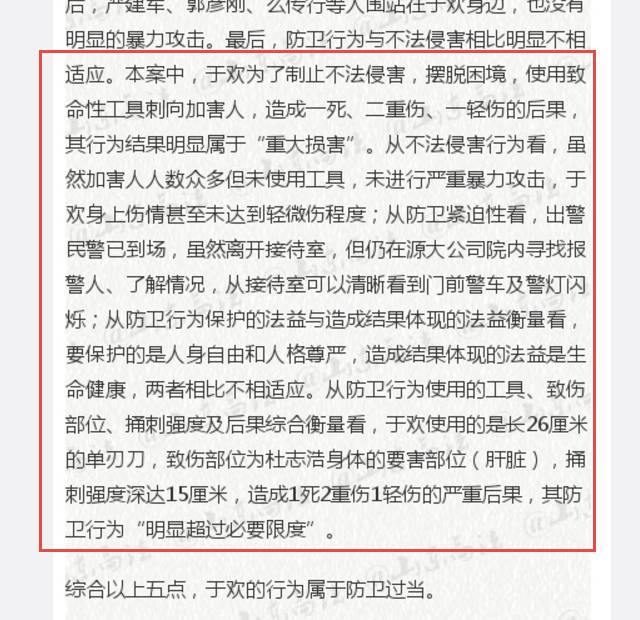 那么如此一來,于歡導致的1人死亡、2人重傷、1人輕傷的防衛行為,就明顯超出了不法侵害的程度,因此無法認定為正當防衛了。