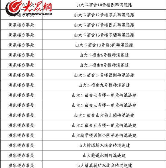 在這次公布的違法建設拆除臺賬中,寬厚里有8處板房加樓頂違建上榜;另外,山大洪家樓校區的31處磚混違建以及南部山區的數十處農家樂違規建筑也在這次拆除之列。