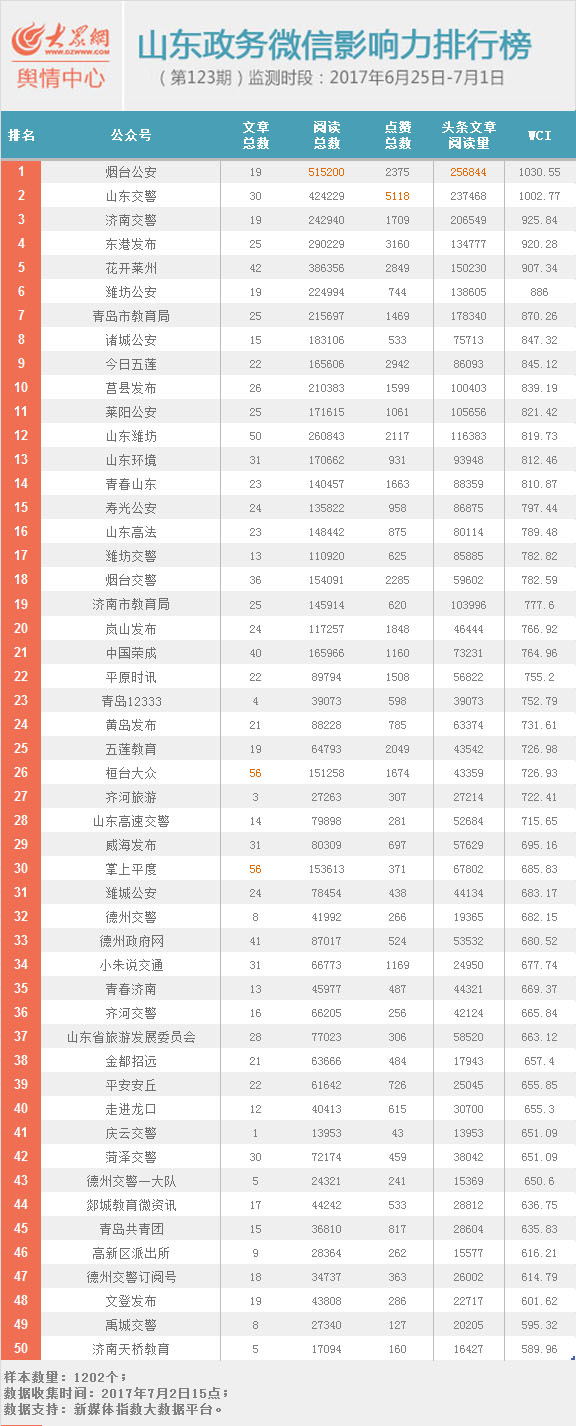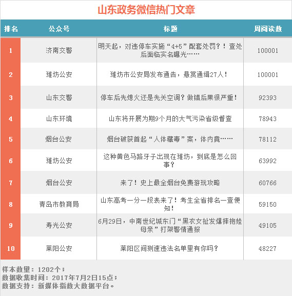 大眾網(wǎng)濟南7月4日訊 山東政務微信影響力排行榜本周發(fā)布第123期。本周政務榜前三甲為“煙臺公安”、“山東交警”和“濟南交警”。“齊河旅游”和“慶云交警”分別進步254和252名,并列黑馬。熱文榜兩篇文章閱讀數(shù)登頂10w+,“山東交警”單篇文章獲贊近兩千。