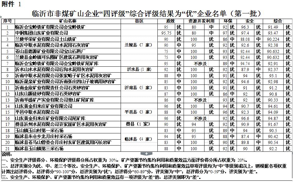 大眾網濟南7月13日訊 13日,經過近乎嚴苛綜合評級,臨沂市安委辦對外公布了第一批180 家非煤礦山企業名單。其中獲得“優評”的企業有21 家,“中評”96 家,“差評”63 家。據大眾網記者了解,此次獲得“差評”的企業,如果整改不到位,將被責令關閉淘汰;而獲得“優評”的企業,則會被列入“發展壯大一批”名單,給予重點扶持。