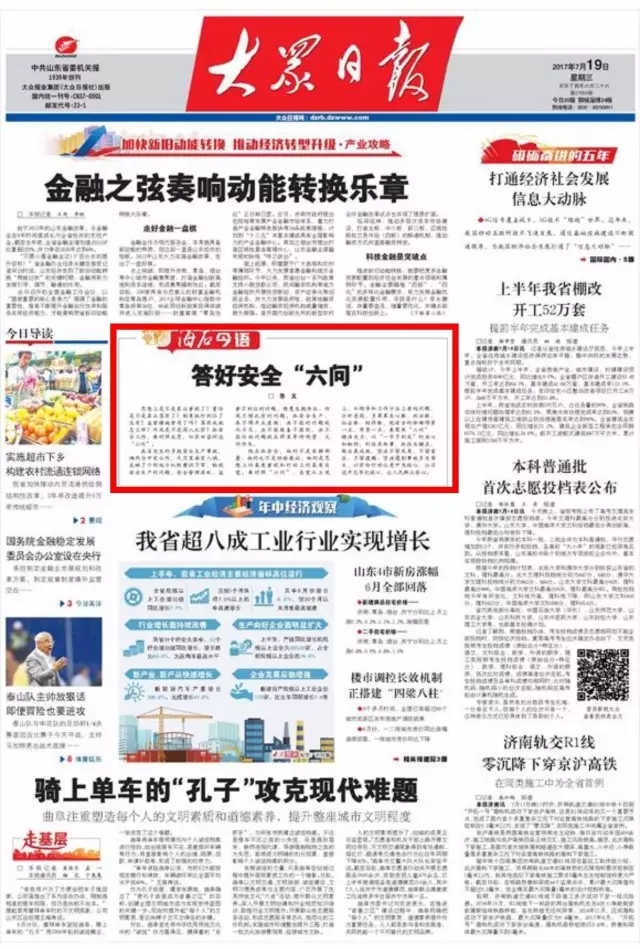 7月19日,大眾日報“海右今語”專欄刊發(fā)署名魯義的文章《答好安全“六問”》。