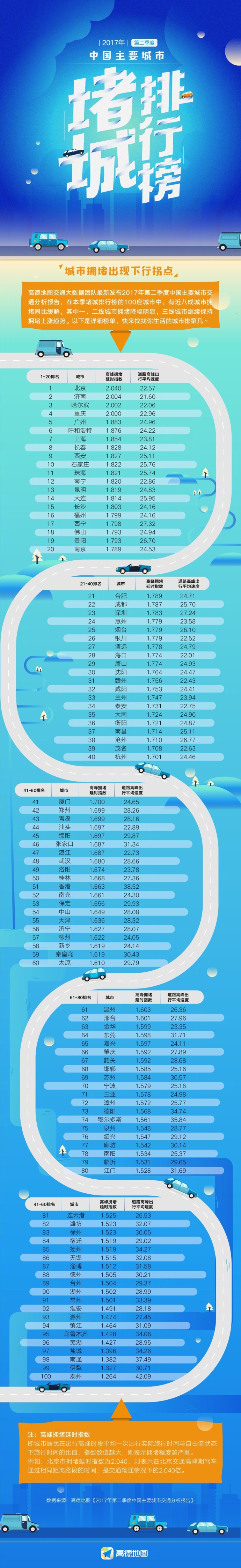 大眾網(wǎng)濟南7月24日訊 24日,高德地圖聯(lián)合交通運輸部科學研究院等權威機構發(fā)布《2017年第二季度中國主要城市交通分析報告》。在第二季度中,全國有 77% 的城市擁堵同比去年同期呈現(xiàn)大面積緩解,城市交通擁堵出現(xiàn)下行拐點。最新堵城Top10分別為:北京、濟南、哈爾濱、重慶、廣州、呼和浩特、上海、長春、西安、石家莊。與第一季度相比,濟南排名由第一位下降到第二位,告別“首堵”地位。