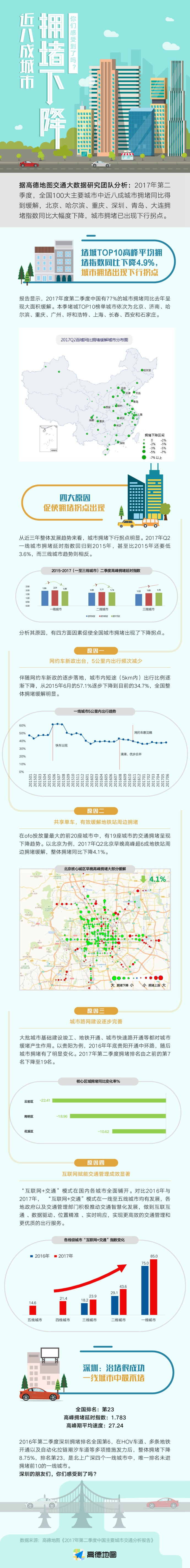 根據(jù)分析,有四大原因導致?lián)矶聽顩r得到緩解。一是網(wǎng)約車新政出臺,5公里內出行頻次減少。二是共享單車的出現(xiàn)。三是城市路網(wǎng)建設逐步完善。四是互聯(lián)網(wǎng)賦能交通管理成效顯著。