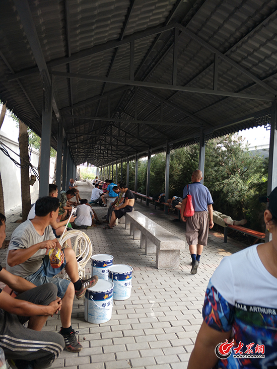 25日上午,記者在全福立交橋西北角公交車場外側綠化帶附近看到,這里變成了一 個小院,院門口豎著一塊標有“用工接洽處”的藍色牌子。入口處擺放著一個木桌,上 面放著三個喇叭和一本《全福橋勞務市場用工單位/個人登記》表格,幾名手臂帶有袖 標的管理人員坐在一旁,身后和斜對面都豎著寫有“用工登記處”的藍色牌子。距離門 口不遠處,豎著一塊印有“全福立交橋外來務工人員管理規定”的告示牌,院內總面積 近千平方米,劃分成飲水區、生活區、休息區等區域。院內設有數十張長椅,院內向北 ,建起了一座長約170米的長廊,也設有長椅和石凳,為務工人員們避暑和遮擋風雨。