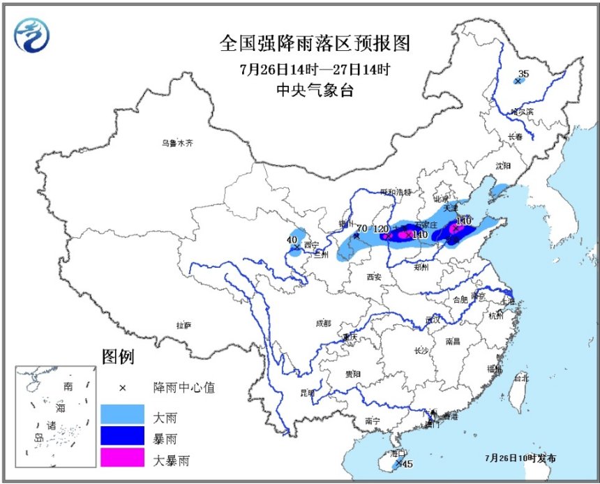 預計7月26日14時至27日14時,陜西北部、山西中部、河北中南部、天津南部、山東北部以及寧夏東南部、甘肅東部、青海東北部等地的部分地區有大雨或暴雨,其中,陜西北部、山西中部、山東北部等地局地有大暴雨(100~140毫米);上述部分地區有短時強降水,局地伴有雷暴大風等強對流天氣,最大小時雨強可達20~50毫米,局地超過60毫米。