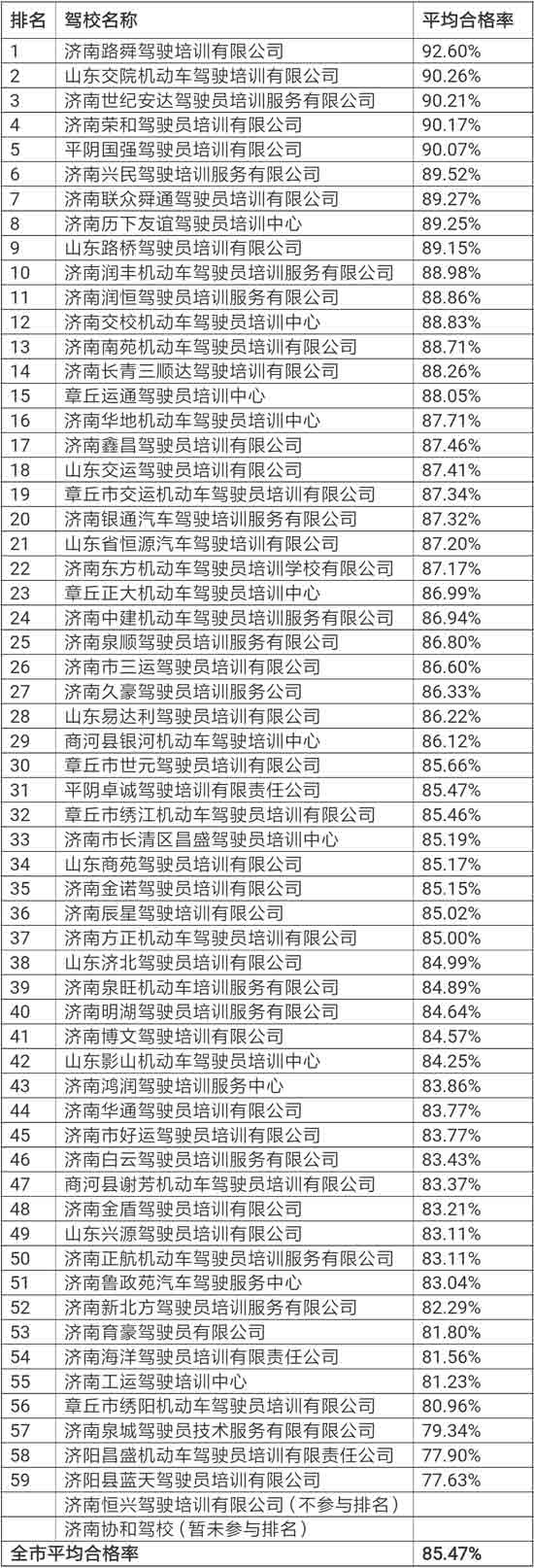 與以往將市區駕校與縣區駕校分別排名不同,這次車管所對全市59家駕校進行了統一排名。排行榜顯示,2017年上半年濟南市駕考平均合格率排名前三的駕校為濟南路舜駕校、山東交院駕校、濟南世紀安達駕校,這三家駕校的合格率均在90%以上。而濟南泉城駕校、濟陽昌盛駕校、濟陽藍天駕校排最后三名,平均合格率均低于80%。排名第一的路舜駕校與倒數第一的藍天駕校之間,合格率相差近15個百分點。