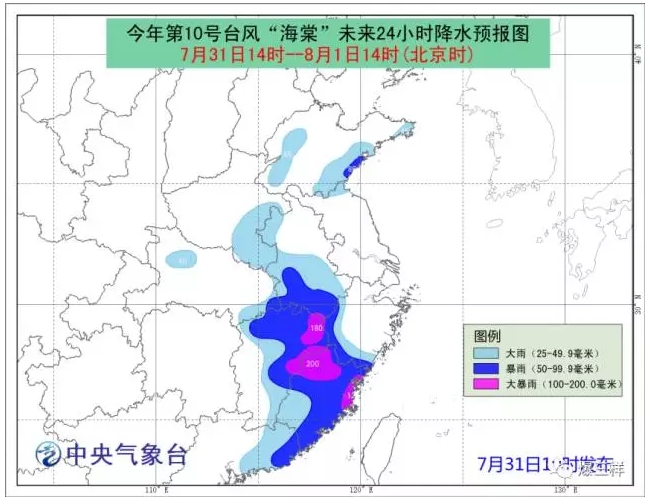 中央氣象臺7月31日10時繼續發布暴雨黃色預警:預計7月31日14時至8月1日14時,福建、廣東東部、江西東部和北部、浙江西南部、安徽西南部、湖北東部、河南東南部、山東東南部等地有大雨或暴雨,其中,福建西北部和東部、江西東北部等地的部分地區有大暴雨(100~200毫米),最大小時雨強可達60毫米。