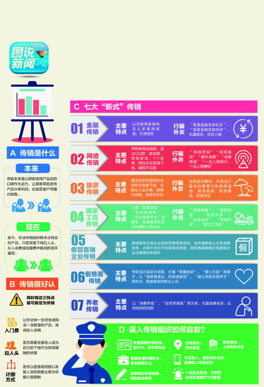 目前我省棗莊、東營(yíng)、泰安、日照、萊蕪、濟(jì)南、青島、淄博、煙臺(tái)、濰坊、濟(jì)寧、臨沂、濱州、菏澤14市已被認(rèn)定為無傳銷城市,占全省城市數(shù)量的82%。實(shí)際上,形形色色的傳銷騙局已盛行多年,屢禁不絕,近年來更借助社交網(wǎng)絡(luò)出現(xiàn)了多個(gè)“變種”。當(dāng)前傳銷主要有哪些形式?如何識(shí)別傳銷?誤入傳銷組織如何自救?半島逐一進(jìn)行了梳理。